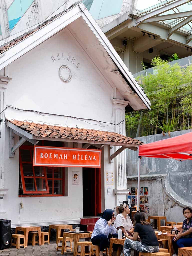Warna merah menyala dari interior dan poster-poster jadul yang menghiasi Roemah Helena jadi atraksi menarik. Tersedia area duduk indoor dan outdoor, dengan meja pendek dan bangku plastik berwarna coklat.