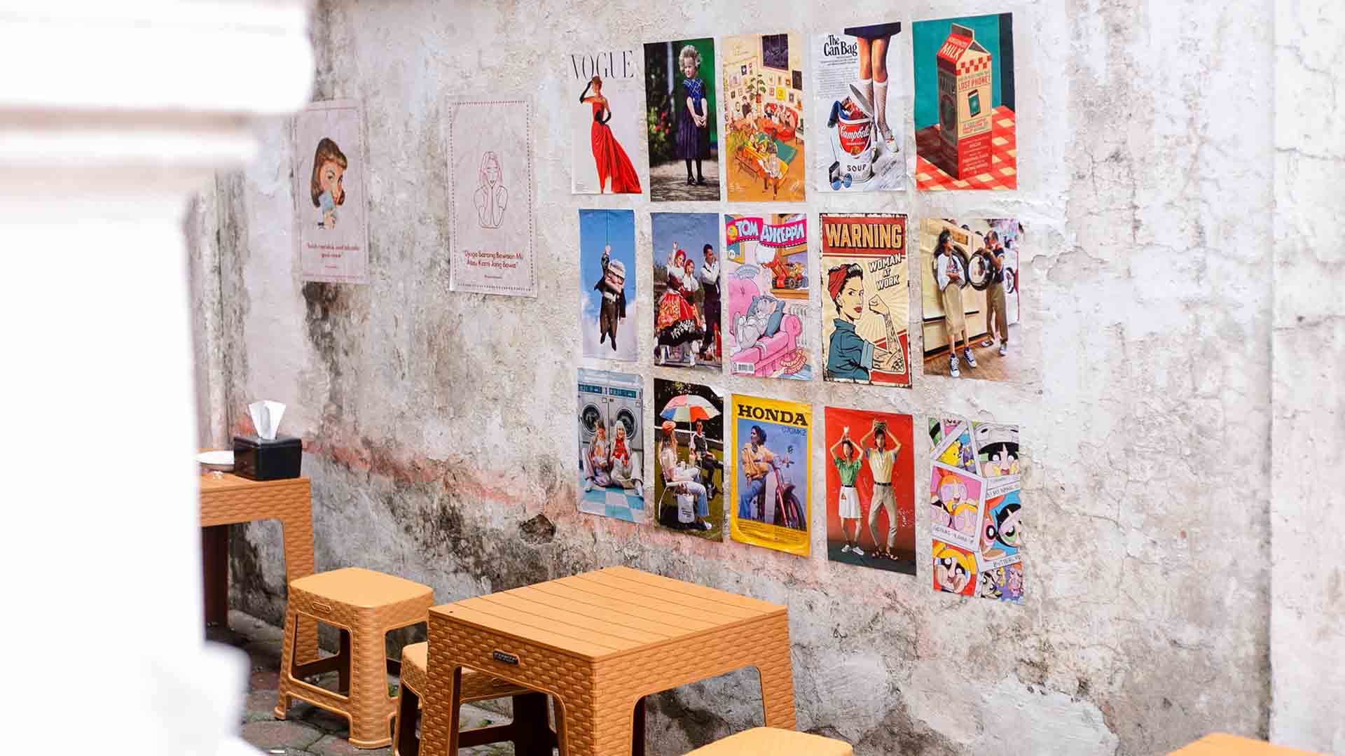 Warna merah menyala dari interior dan poster-poster jadul yang menghiasi Roemah Helena jadi atraksi menarik. Tersedia area duduk indoor dan outdoor, dengan meja pendek dan bangku plastik berwarna coklat.