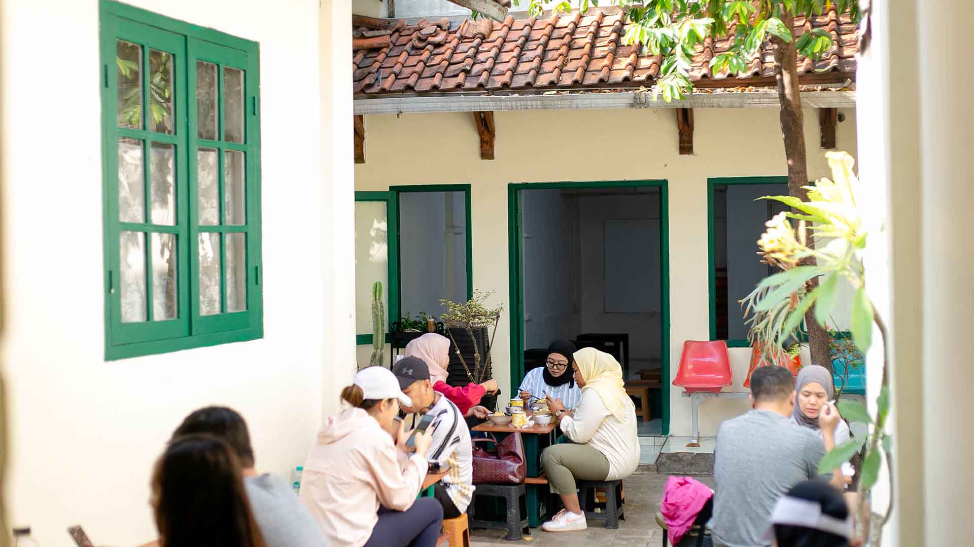 Djaya Mandiri Sejahtera mengadopsi konsep kedai kopi khas peranakan yang didominasi warna terang dan banyak pepohonan, bikin suasana estetik dan cocok untuk foto-foto.